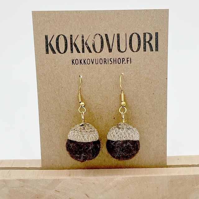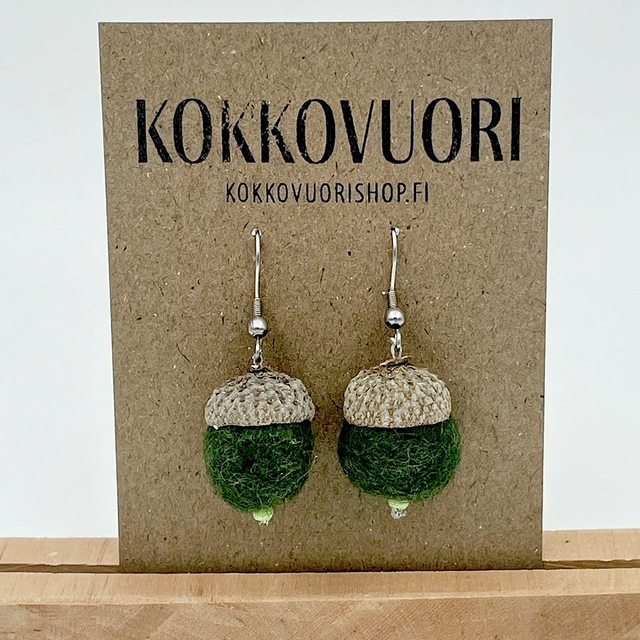 Ihanan kevyet korvakorut, joissa kantena kotimaisen tammen hattu ja terhona villainen helmi.