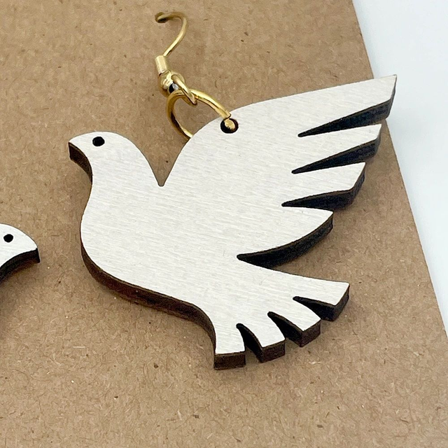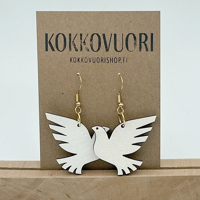 Ihanan kevyet kotimaisesta koivuvaanerista tehdyt korvakorut, joissa valkoinen rauhankyyhky.