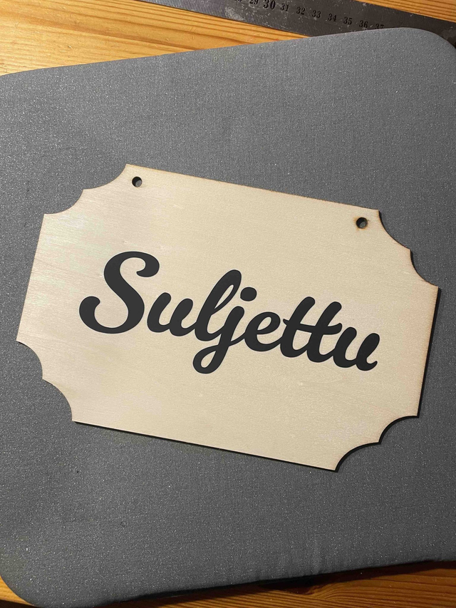 Muotoon leikattu vanerikyltti on kooltaan 22,5cm x 14,5cm. Teksti on mustalla molemmin puolin kylttiä. Kyltti on käsitelty kosteutta kestäväksi, mutta suoraan vedessä olemista se ei siedä. Kyltissä on musta silkkinauha, josta sen voi ripustaa roikkumaan naulaan tai ovennuppiin.